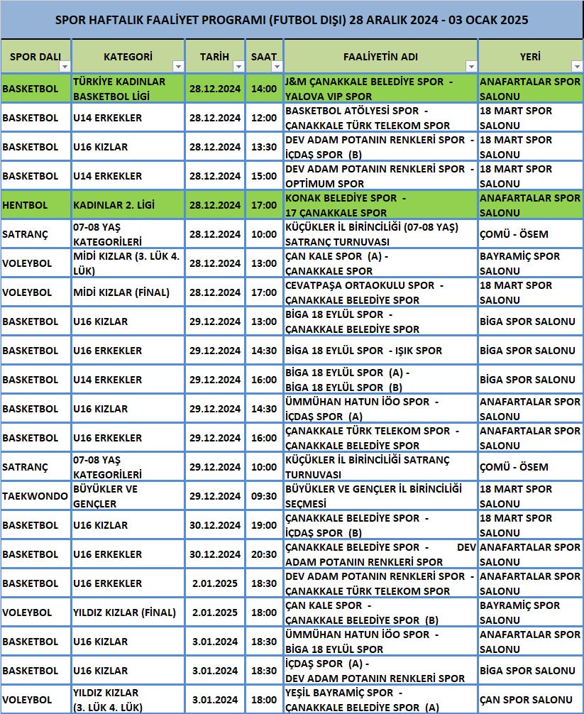 SPOR HAFTALIK FAALİYET PROGRAMI (FUTBOL DIŞI) 28 ARALIK 2024 - 03 OCAK 2025
