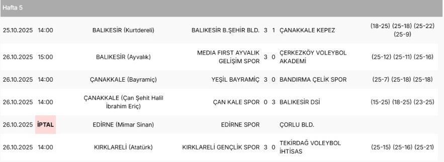 TVF KADINLAR VOLEYBOL 2.LİGİ 5.GRUP, 5. HAFTA MÜSABAKALARI SONUCUNDA YEŞİL BAYRAMİÇSPOR TAKIMIMIZ MAÇ EKSİĞİ İLE 2. SIRADA, KEPEZSPOR TAKIMIMIZ 4. SIRADA YER ALMAKTADIR