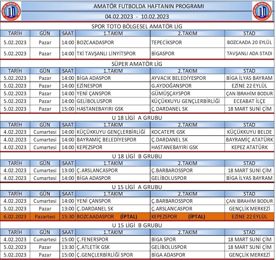 İPTAL EDİLEN U 15 LİGİ A GRUBU MÜSABAKASI 04.22.2023 – 10.02.2023 TARİHLERİ ARASINDAKİ HAFTALIK FAALİYET PROGRAMINDA İPTAL EDİLEN U 15 LİGİ A GRUBU MÜSABAKASI İptal edilen U 15 ligi A Grubu Müsabakası 06.02.2023 Pazartesi günü saat 15:30' da Ezine 22 Eylül Stadında oynanması gereken Bozcaadaspor – Kepezspor U 15 Ligi A Grubu Müsabakası yoğun kar yağışı ve elverişsiz hava koşulları nedeniyle ileri bir tarihte oynanmak üzere iptal edilmiştir. HAFTALIK FAALİYET PROGRAMI İÇİN TIKLAYINIZ