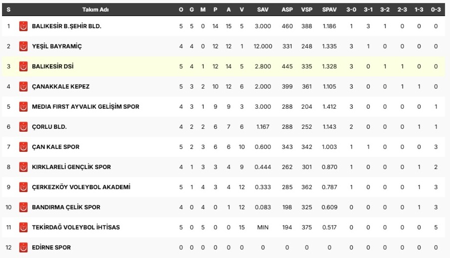 TVF KADINLAR VOLEYBOL 2.LİGİ 5.GRUP, 5. HAFTA MÜSABAKALARI SONUCUNDA YEŞİL BAYRAMİÇSPOR TAKIMIMIZ MAÇ EKSİĞİ İLE 2. SIRADA, KEPEZSPOR TAKIMIMIZ 4. SIRADA YER ALMAKTADIR