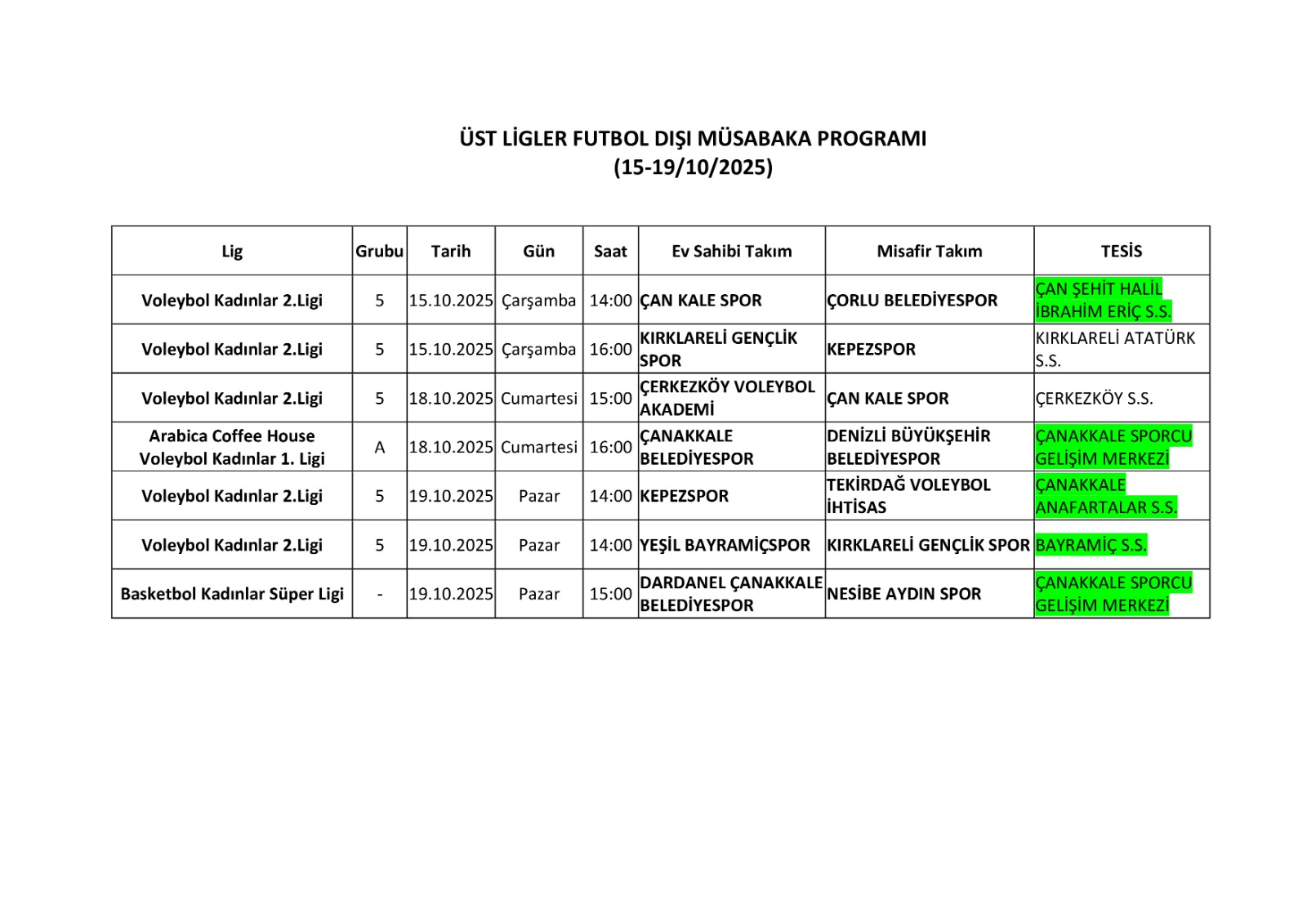 ÜST LİGLER FUTBOL DIŞI MÜSABAKA PROGRAMI (15-19/10/2025)